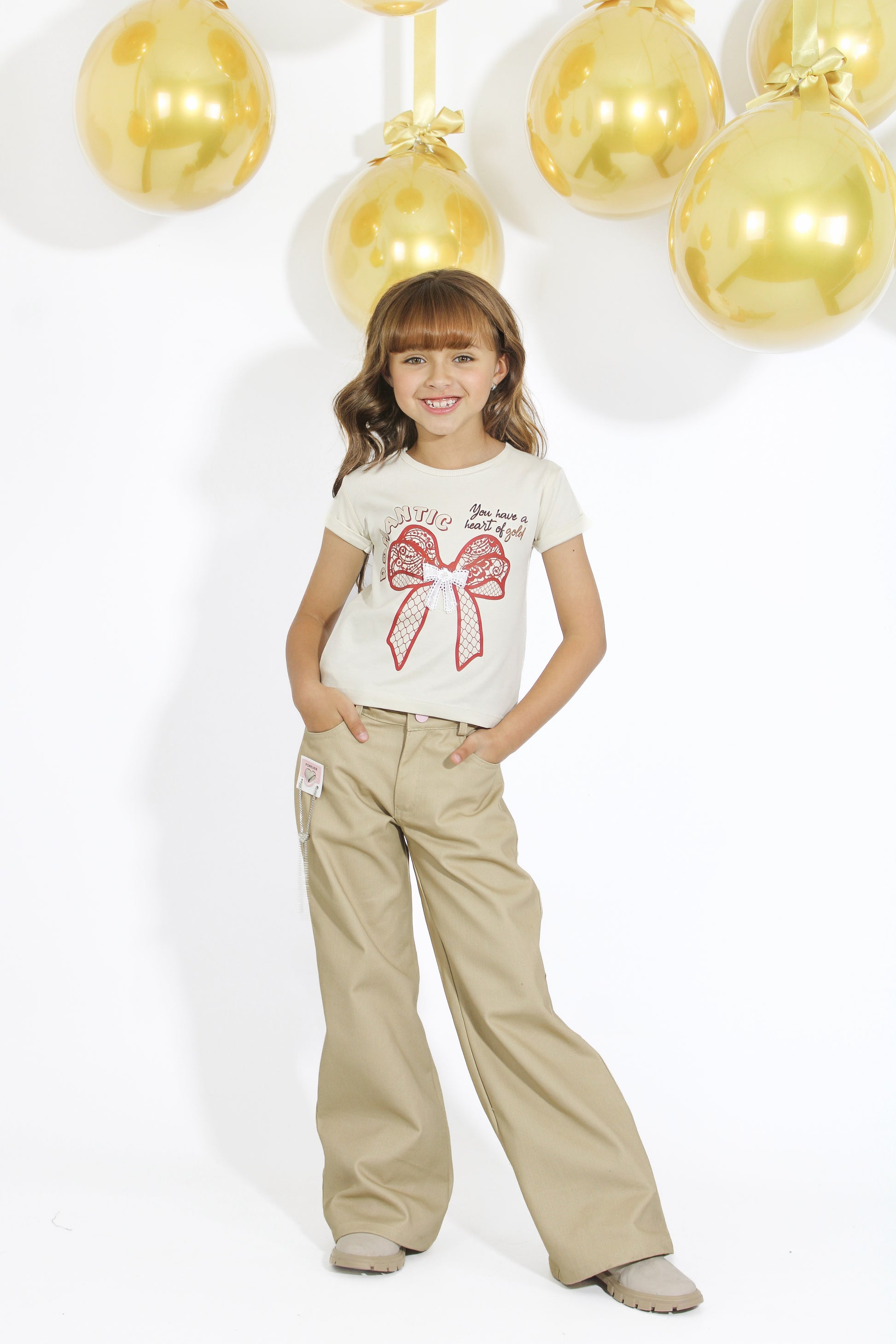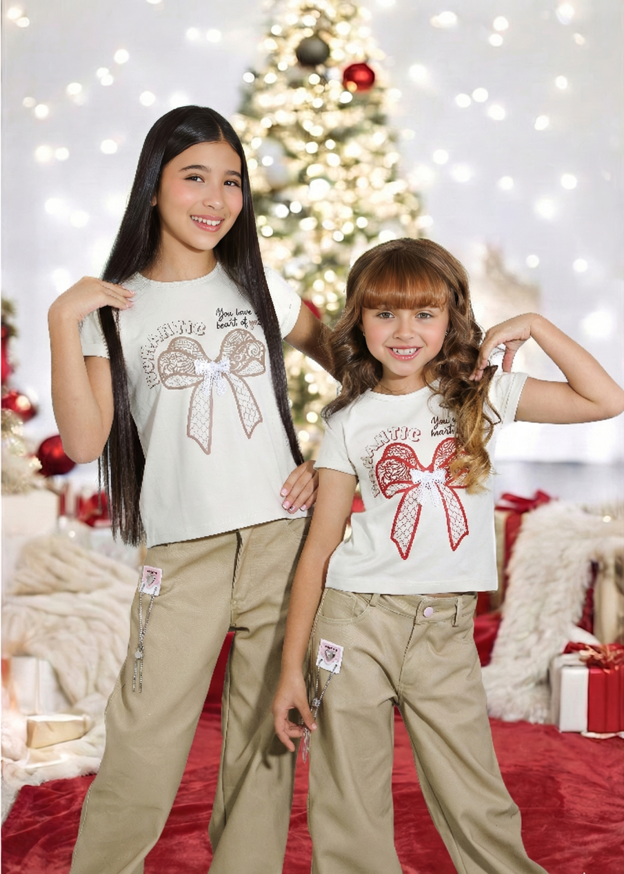 Una camiseta que ilumina cualquier outfit con un toque romántico y moderno. El lazo estampado con aplicación de encaje aporta textura, brillo sutil y ese detalle que hace que tu niña destaque sin esfuerzo. Es suave, fresca y perfecta para darle un aire delicado.