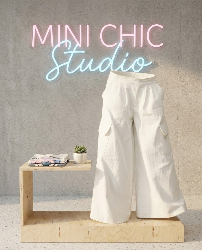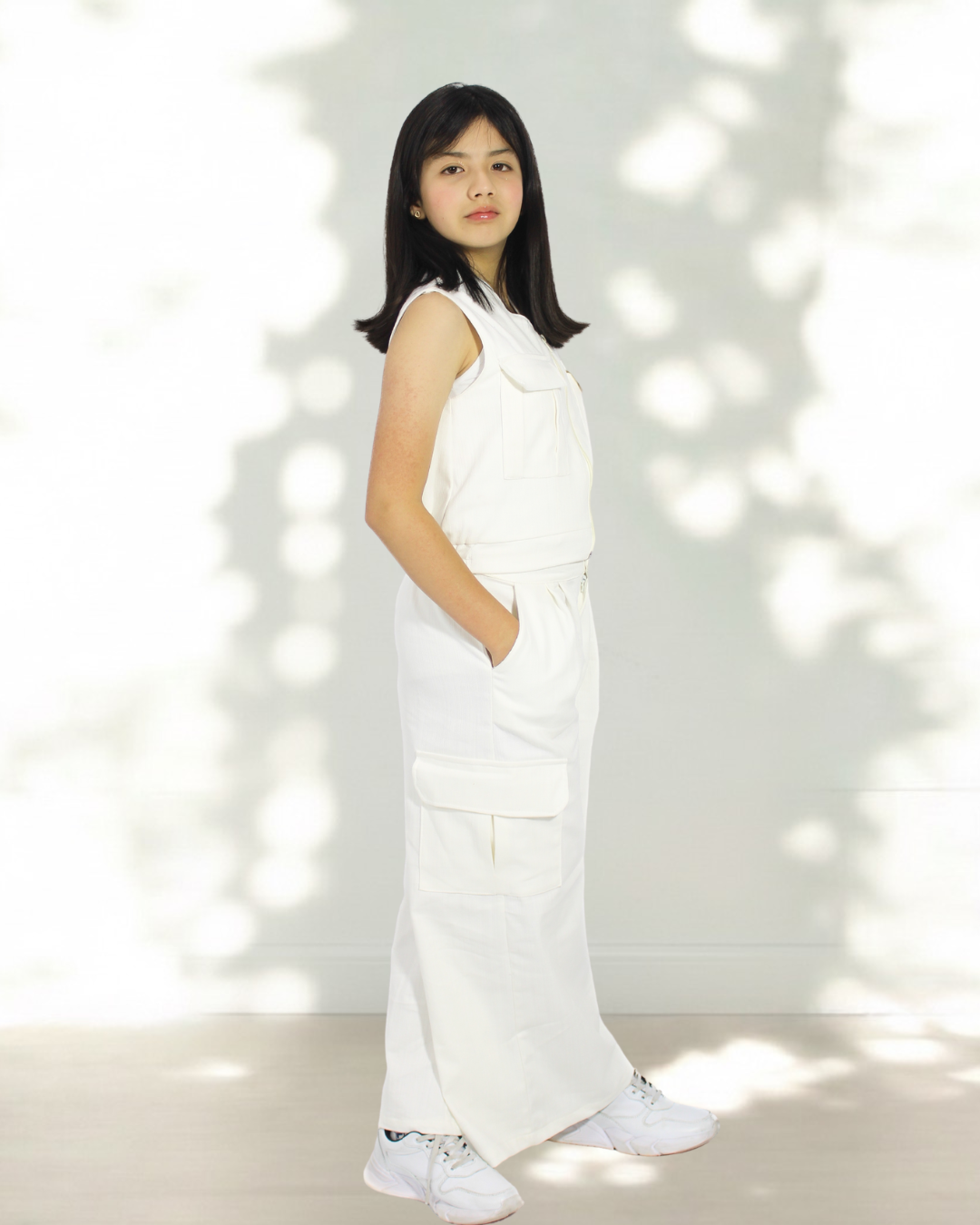 Descripción de la prenda: Pantalón blanco cargo con bolsillos laterales, pretina cómoda y pierna ancha. Suave, moderno y fácil de combinar.
