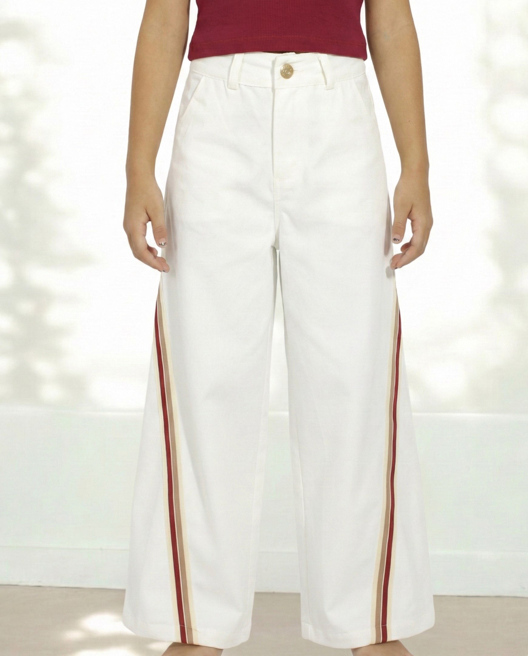 Características: Tela Drill, suave y ligera, Pierna ancha moderna, pantalón estilo palazzo, Franjas vinotinto estilo navideño, Pretina cómoda para movimiento.