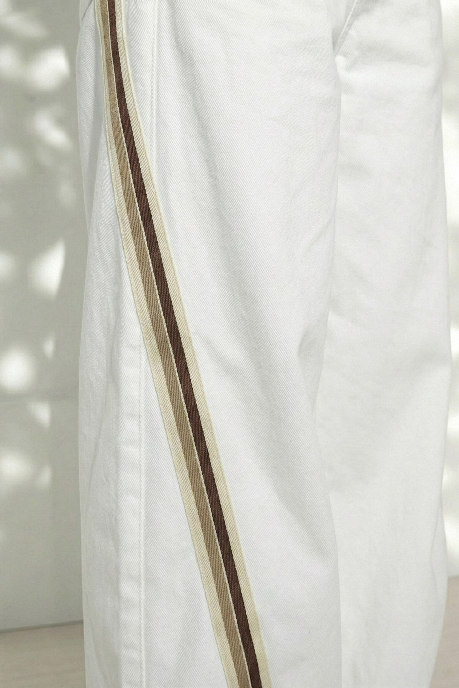 Descripción de la prenda: Pantalón blanco ancho con franjas laterales color caramelo. Tela ligera (RIB), caída perfecta, movimiento completo.