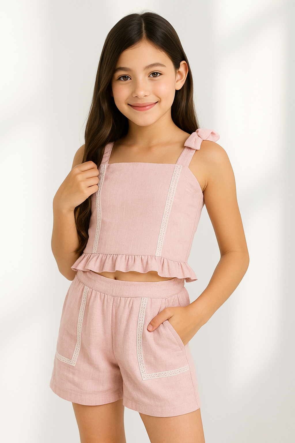 Ligero, fresco y muy cómodo para clima cálido. El Set Rose trae top con tiras de lazo ajustables, espalda smock que se adapta sin apretar y un volante sutil en la base. El short tiene cintura confortable, bolsillos con vivo decorativo y caída suave tipo lino. Perfecto para paseos, fotos y fines de semana.
